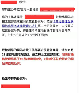 湖南管局在12月會進行核查,所以西部數碼統一發送了通知提醒下用戶,如已經放置備案號和工信部網址www.beian.miit.gov.cn 鏈接的用戶,則無需再進行處理,管局再次復查時,只要查看到有備案號并鏈接至工信部網站的,就不會進行處罰的,非常感謝您長期對我司的支持.由此給您帶來的不便之處,敬請原諒!謝謝!