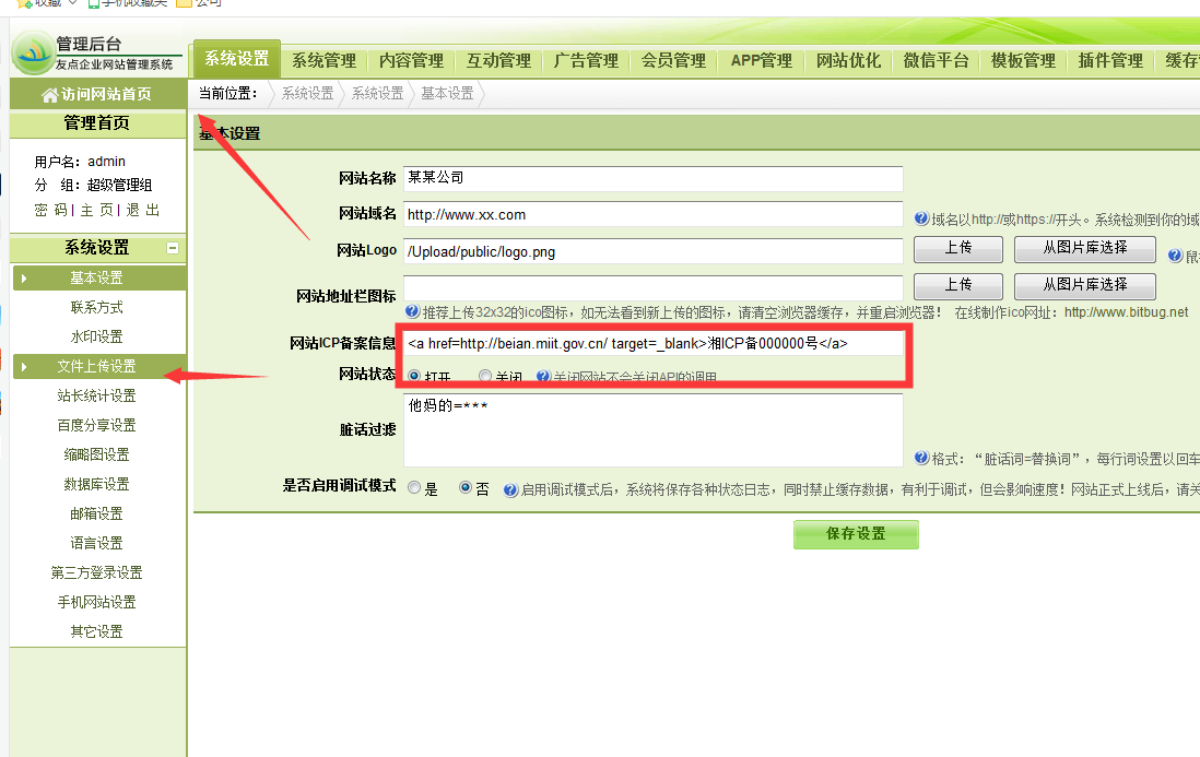 *:打開后臺網址進入系統設置-基本設置 如下圖頁面,在箭頭地方添加如下代碼: